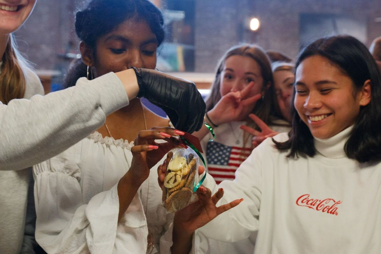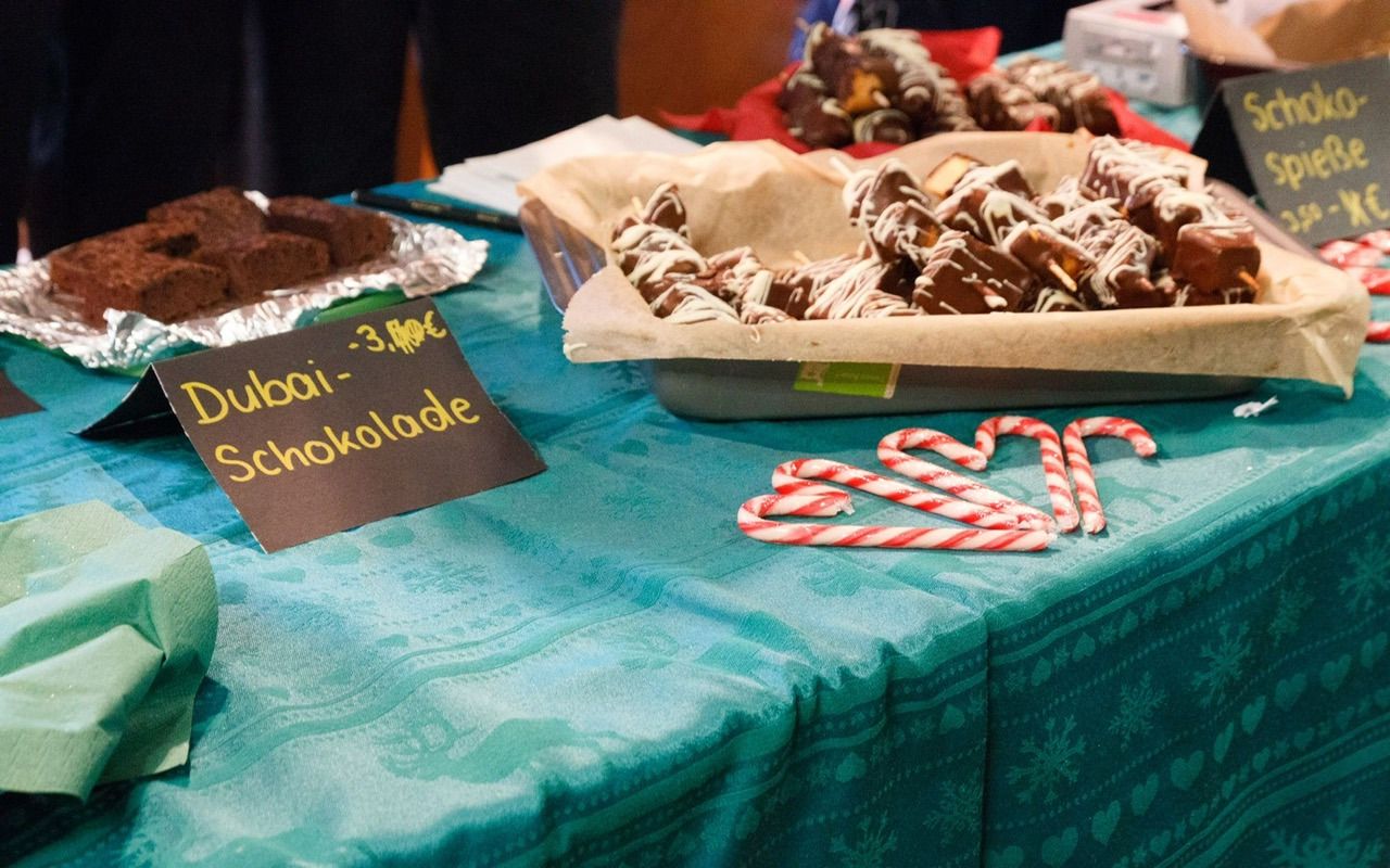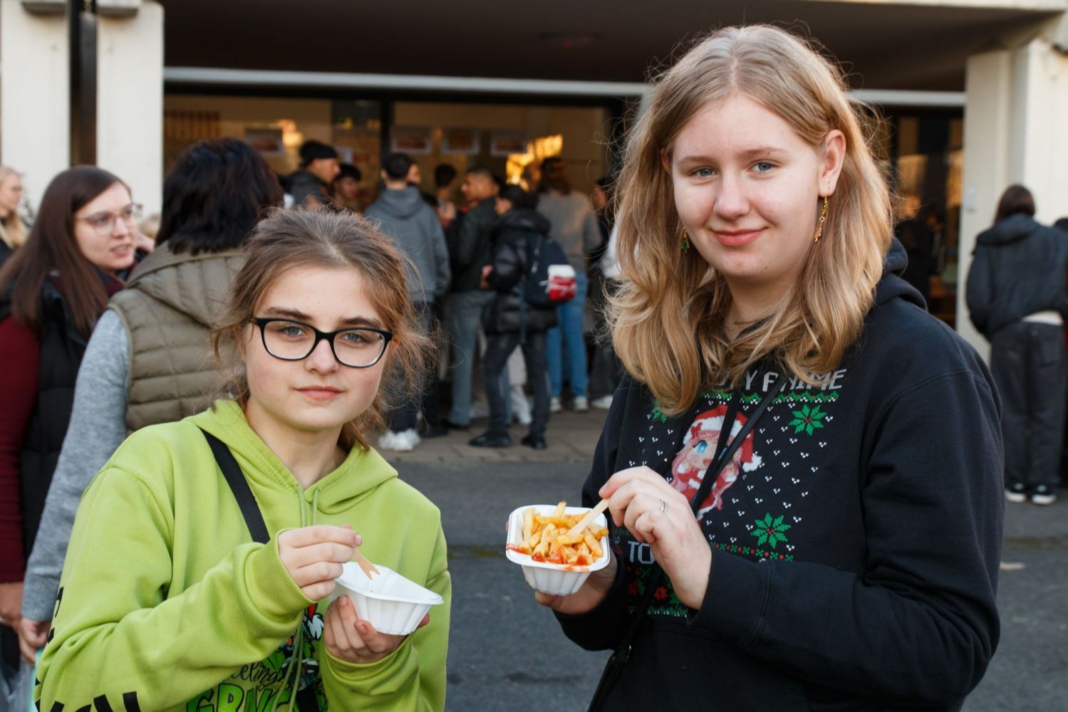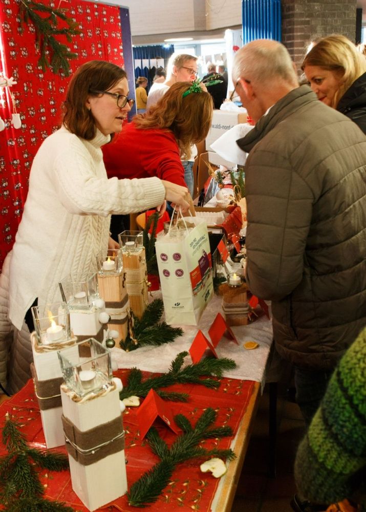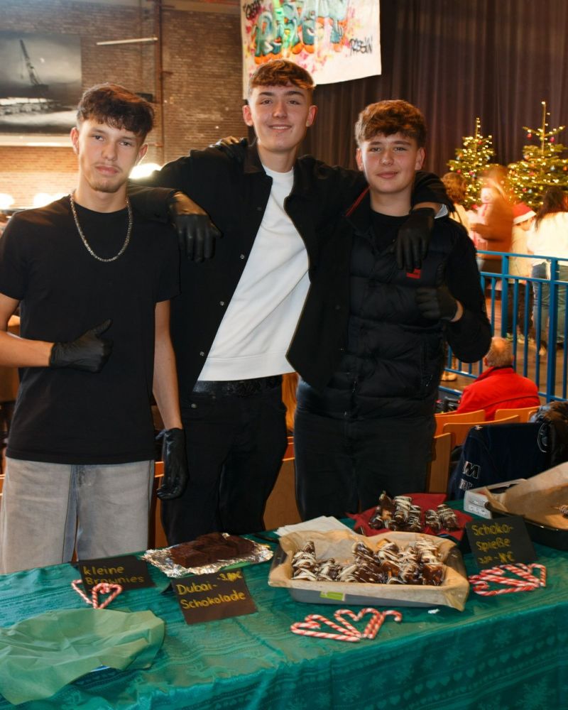Viele Gäste eilten sofort durch die Hallen, um ein begehrtes Adventsgesteck am Stand im Speisesaal zu ergattern. Andere hielten im Eingangsbereich an, um sich erst einmal ein Erfrischungsgetränk zu kaufen. Im Laufe der Zeit bildeten sich lange Schlangen an den Versorgungsständen, die wir außerhalb auf dem Schulhof untergebracht hatten. Noch nie waren so viele Ehemalige vor Ort wie in diesem Jahr, das war die Einschätzung mehrerer Kolleginnen und Kollegen, die einen guten Gesamtüberblick über viele Jahre Weihnachtsmarkt haben. Immer wieder wurden wir angesprochen, weil jemand auf der Suche nach seinem ehemaligen LK-Lehrer war, immer wieder traf man Kolleginnen und Kollegen, die aus dem Ruhestand heraus mal wieder den Stoppenberg besucht haben. Und viele Kolleginnen und Kollegen waren mit ihren kleinen Kindern vor Ort. Das war natürlich für die Schülerinnen und Schüler etwas Besonderes. Auch Besuche aus der Elternzeit und Besuche von erst vor Kurzem verabschiedeten Kolleginnen fanden statt. Es war sozusagen ein großes Stoppenberger Familientreffen.
