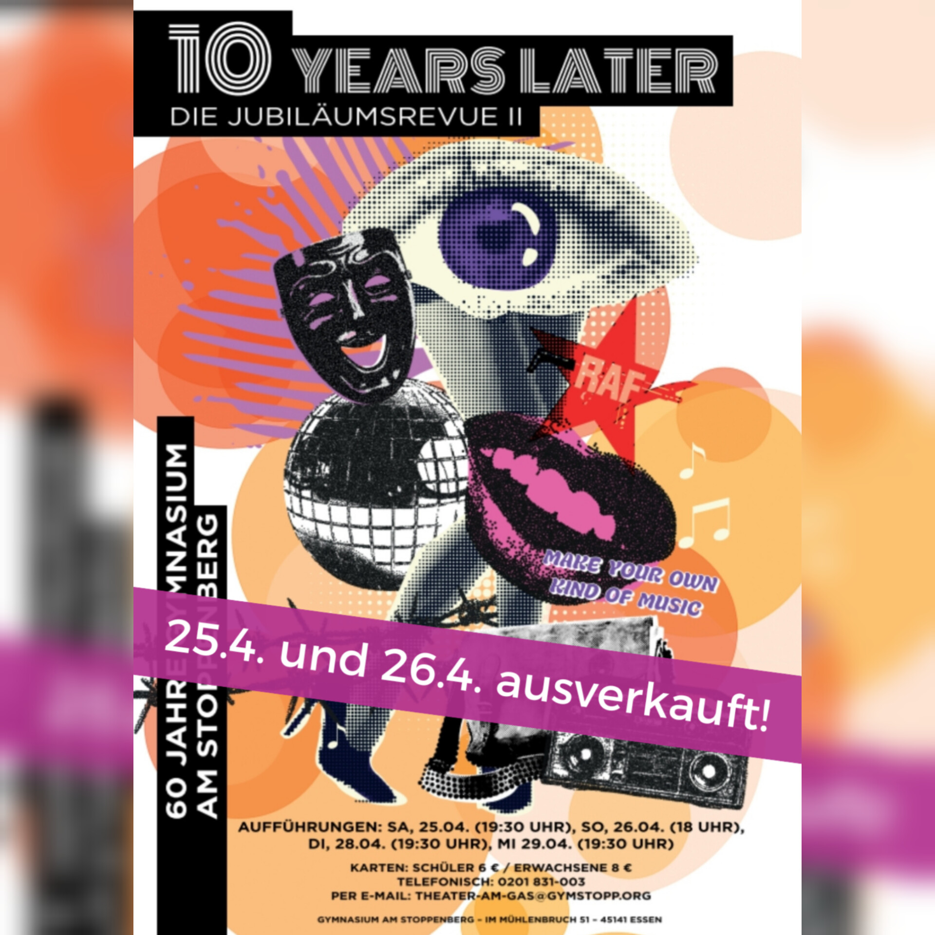 Die Premiere unserer Jubiläumsrevue "10 years later" am 25.4. und die Vorstellung am 26.4. sind bereits ausverkauft! Danke für euer umwerfendes Interesse an unserem Stück!