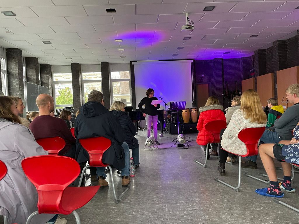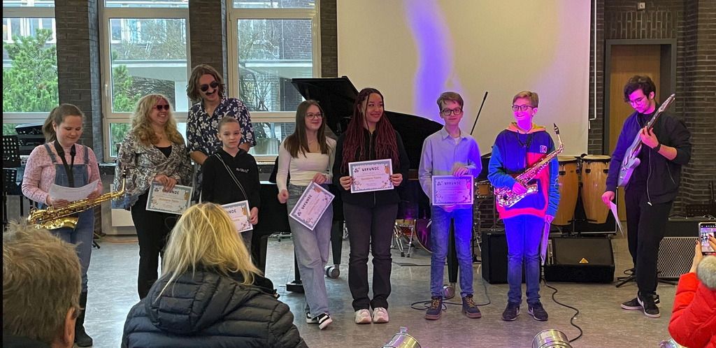 Auch wenn weniger Teilnehmer als in den letzten Jahren sich angemeldet hatten, zeigte die Auswahl der Musiker jedoch, dass es an unserer Schule eine schöne, lebendige Musikerszene gibt, die das Schulleben bei den unterschiedlichsten Anlässen bereichert. Da sich bei den einzelnen Darbietungen ein echter Vergleich der Leistungen kaum anbot, aufgrund der unterschiedlichen Altersspanne, aber auch der Vielfalt der Instrumente, bekam jeder Teilnehmer, wie Frau Nolte in ihrer ansprechenden Moderation angekündigt hat, eine Urkunde und einen Kinogutschein überreicht.