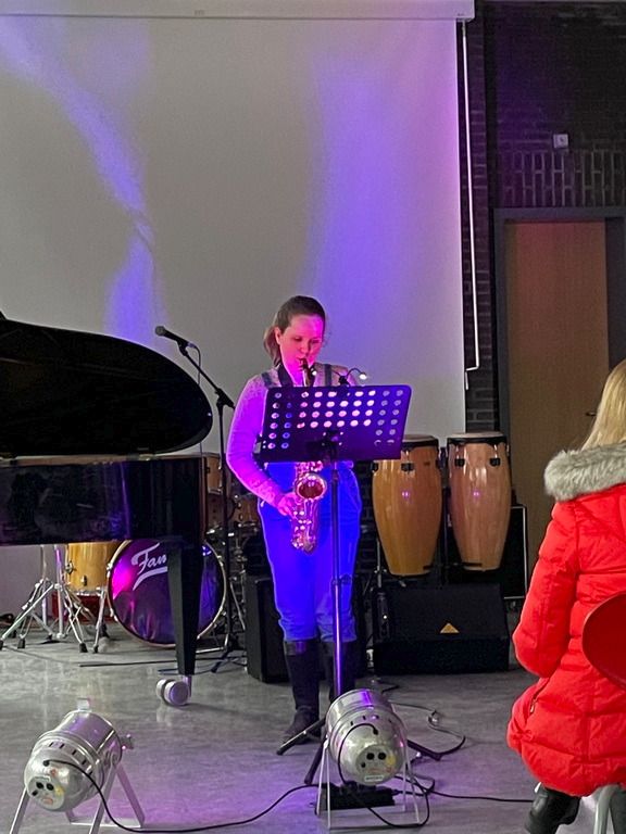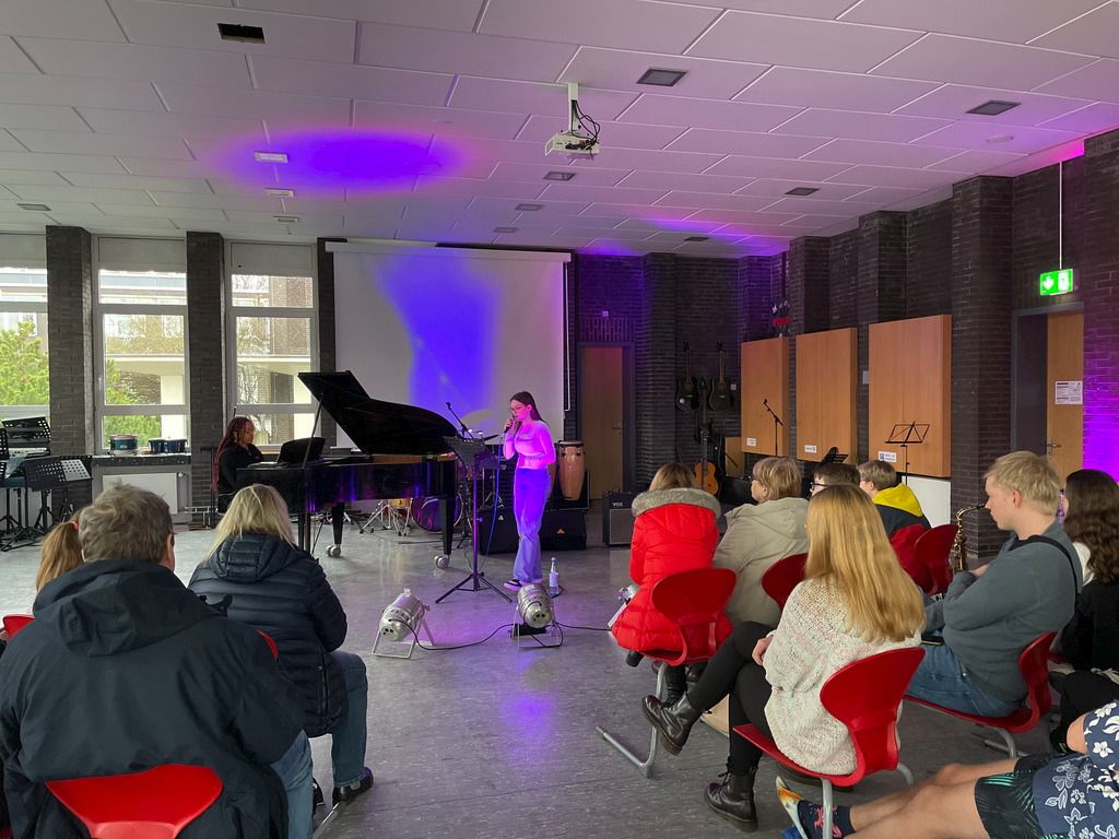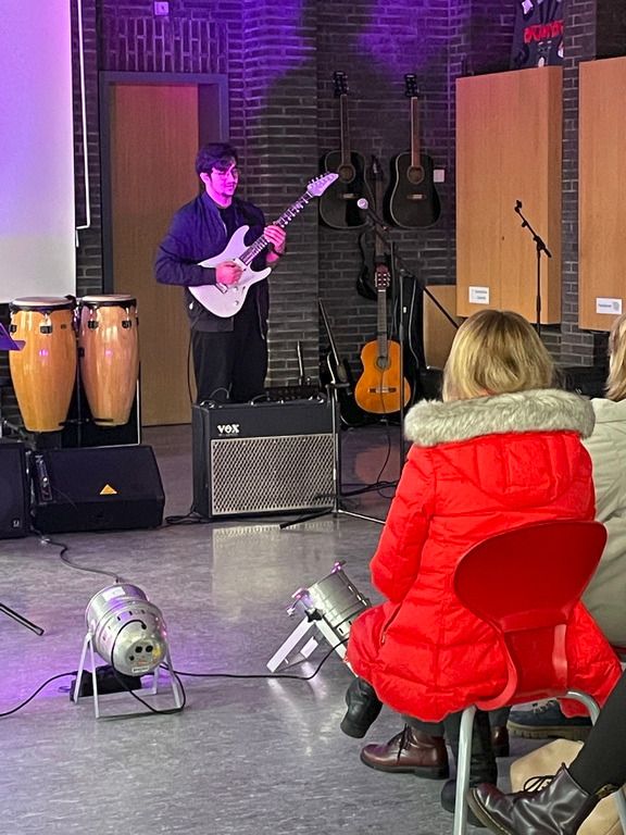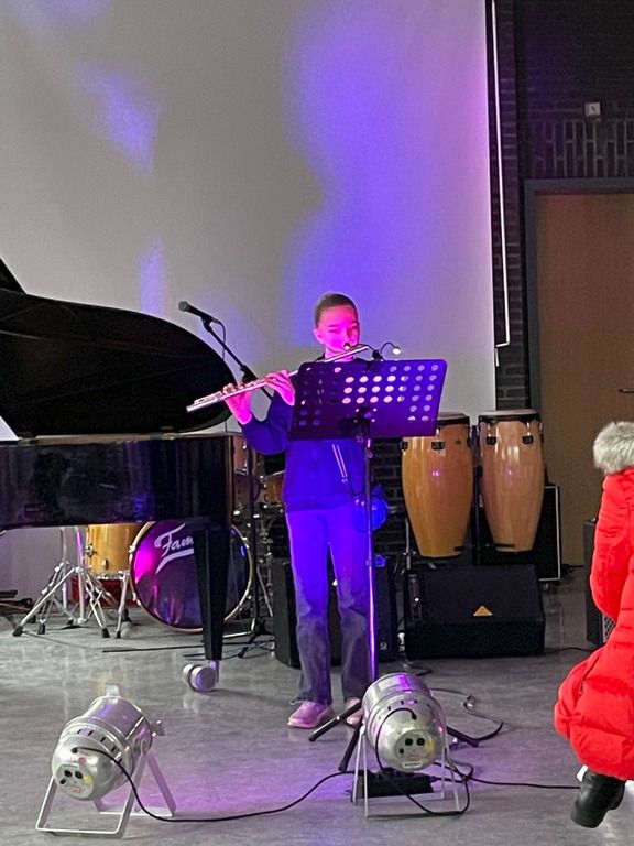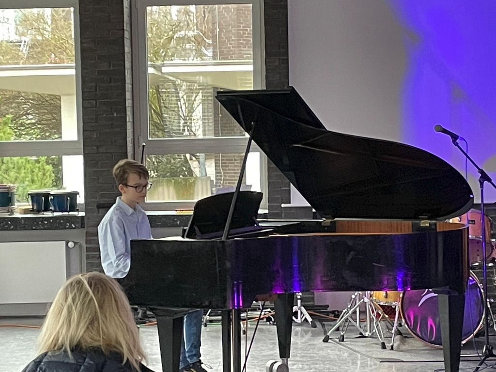 Adele zeigte ihr Können an der Querflöte mit einer Sonatine von Walter Roehr und wurde dabei von ihrem Vater begleitet – der auf diese Weise an seine alte Wirkungsstätte zurückkam, war er doch beim allerersten Durchgang der goldenen Taste einer der Teilnehmer. Jo musizierte die traditionelle Melodie „Greensleeves“ auf dem Saxophon und Hanna (Gesang) und Ndidi (Klavier) interpretierten „When we were young“ von Adele. Ahmet begeisterte mit einer Eigenkomposition für Gitarre und einer selbst produzierten Begleitung. Den Abschluss bildeten Jona und Hanna aus der Q2, die kurz vor ihrem Abitur es nochmal krachen ließen…