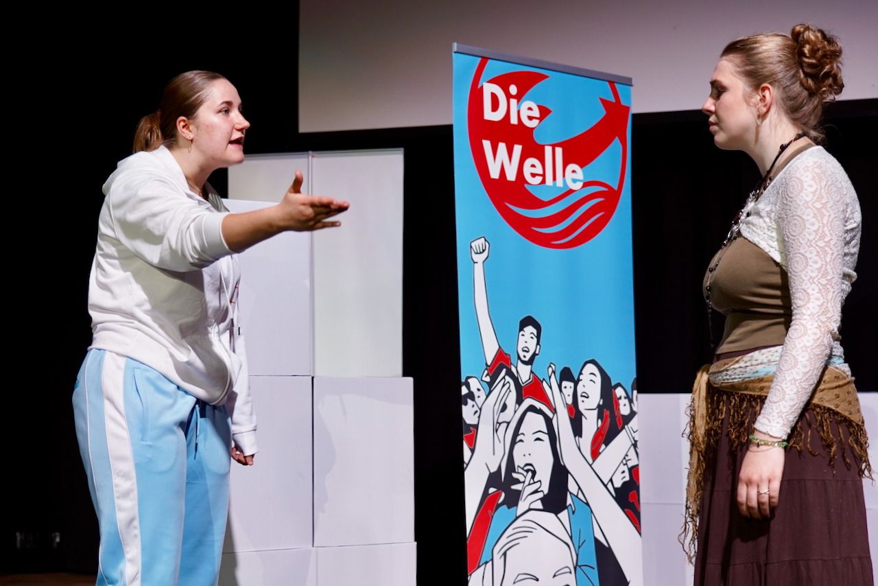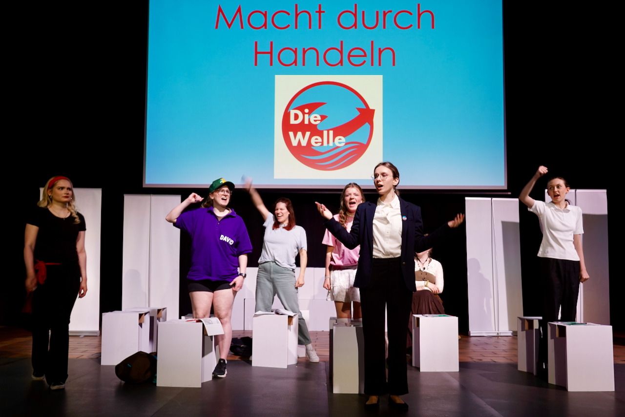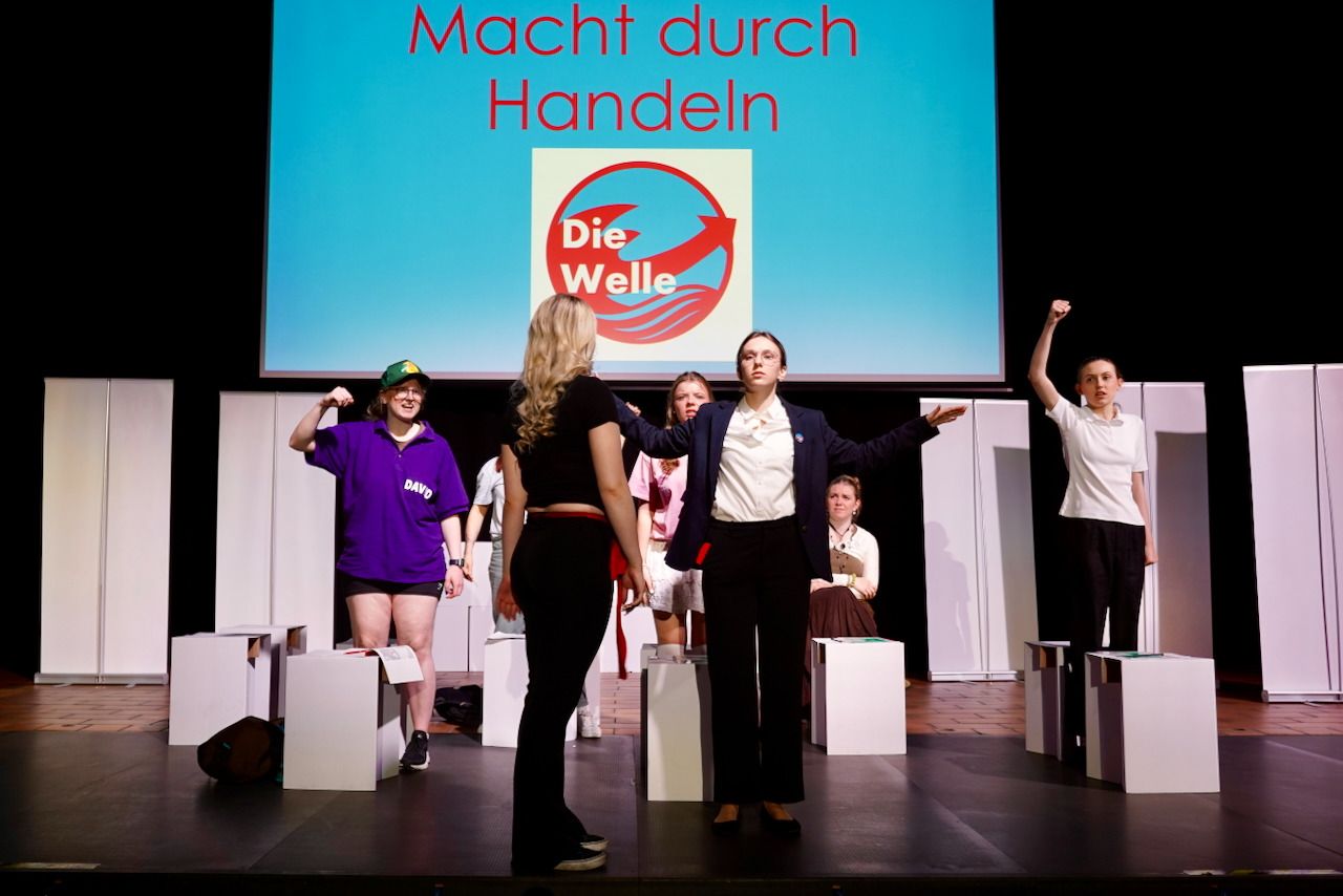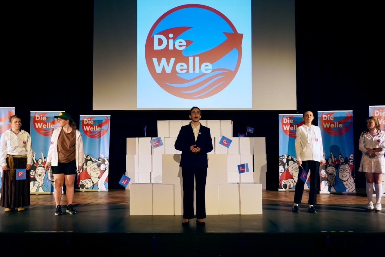 Wir, der Literaturkurs Q1, wollen nicht tatenlos zusehen, wie rechte Kräfte unsere Demokratie zu zerstören trachten, also haben wir unsere hehren Ansprüche, Ihnen hier ein Stück gehobener Kultur zu vermitteln, dem Diktat der Zeit geopfert und wollen mit unserem Stück in diesem Jahr bewusst politisch und pädagogisch sein. In Schulen und überall anderswo muss die Demokratie angesichts der Herausforderungen der Zeit gelehrt, gelebt und verteidigt werden. Freuen Sie sich auf einen politischen Abend mit unserer Version von "Die Welle".